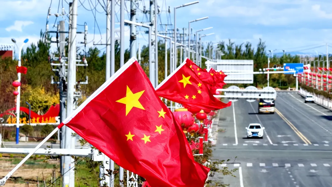 在进入开发区的高速路口,两块大型红色宣传牌格外引人注目,分别书写着“更加紧密团结在以习近平同志为核心的党中央周围 在中国式现代化进程中更好建设美丽新疆”和“热烈庆祝新疆维吾尔自治区成立70周年”的标语。道路两侧灯杆上,鲜艳的五星红旗迎风招展,彰显庄严与喜庆。在下一路口,同样设置了庆祝的主题展板。