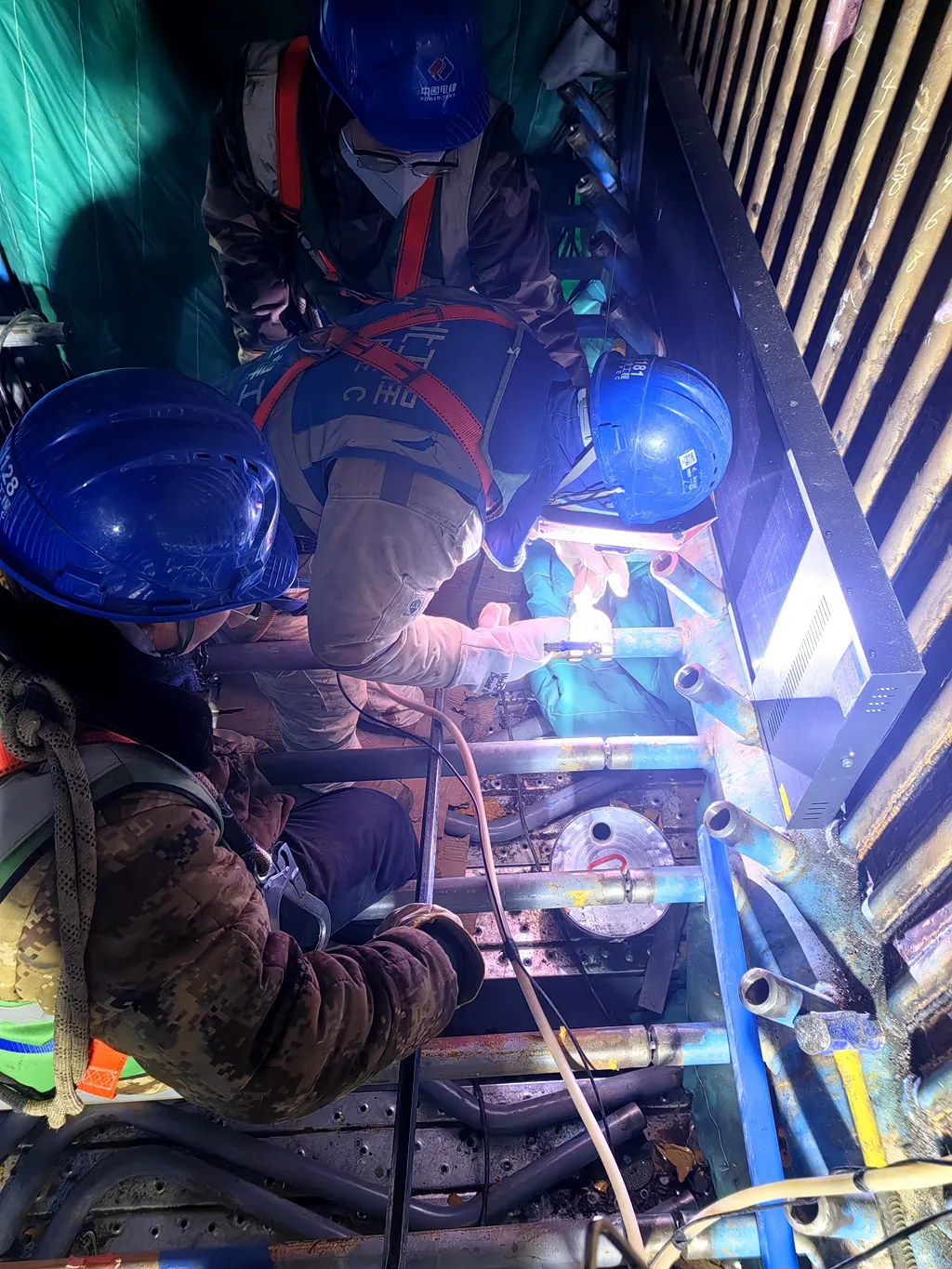 为攻克低温作业难题,新准热电公司与各施工单位协同发力,搭建全链条冬季施工保障机制。现场通过精准搭设密闭暖棚,布设热风幕、电暖器等温控设备,构建起立体防寒网络,并安排专人实时监测,确保作业区温度持续稳定在5℃以上,为施工创造了可靠环境。焊接质量是工程安全的生命线。施工团队严格执行“焊前预热、焊后缓冷”工艺要求,对关键管道焊接实施精准控温;通过色标管理、专项交底、技术员旁站监督等方式,严防焊材错用,从源头把控质量。工程设备部落实现场防护与通风措施,实行24小时轮班值守,确保焊接作业与质量检测无缝衔接。目前,已完成焊口无损检测一次合格率达100%,为一号锅炉受热面焊接完成80%提供了坚实保障,也为2026年实现“双机双投”目标抢占了关键节点。