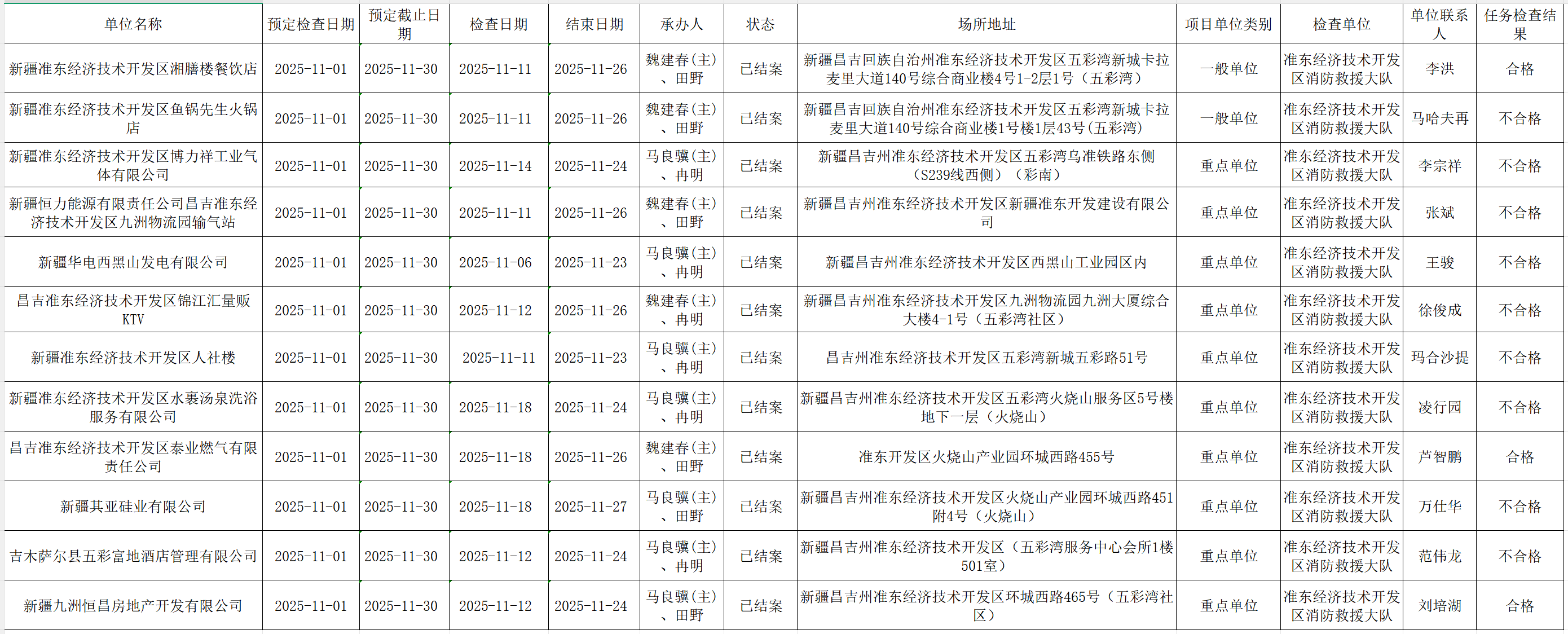 为进一步落实简政放权、放管结合、优化服务要求,坚持依法监管,创新监管方式,规范执法行为,现将准东开发区2025年11月份“双随机、一公开”消防监管信息系统检查结果公示如下: