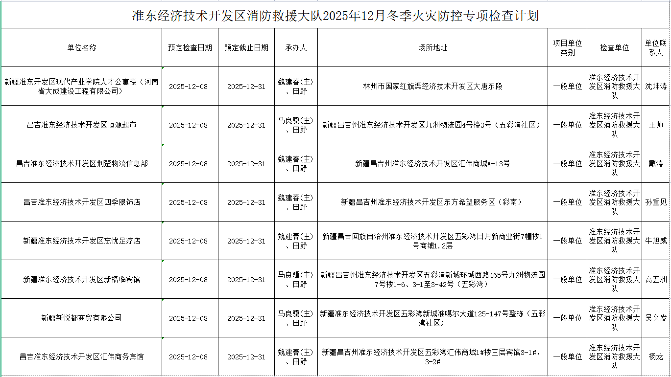 准东经济技术开发区消防救援大队2025年12月冬季火灾防控专项检查计划