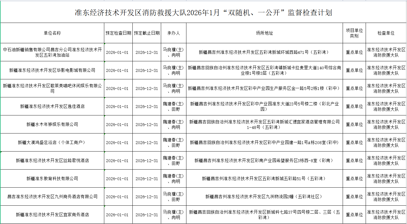 为进一步落实简政放权、放管结合、优化服务要求,坚持依法监管,创新监管方式,规范执法行为,现将准东开发区2026年1月份“双随机、一公开”消防监管信息系统监督检查计划公示如下: