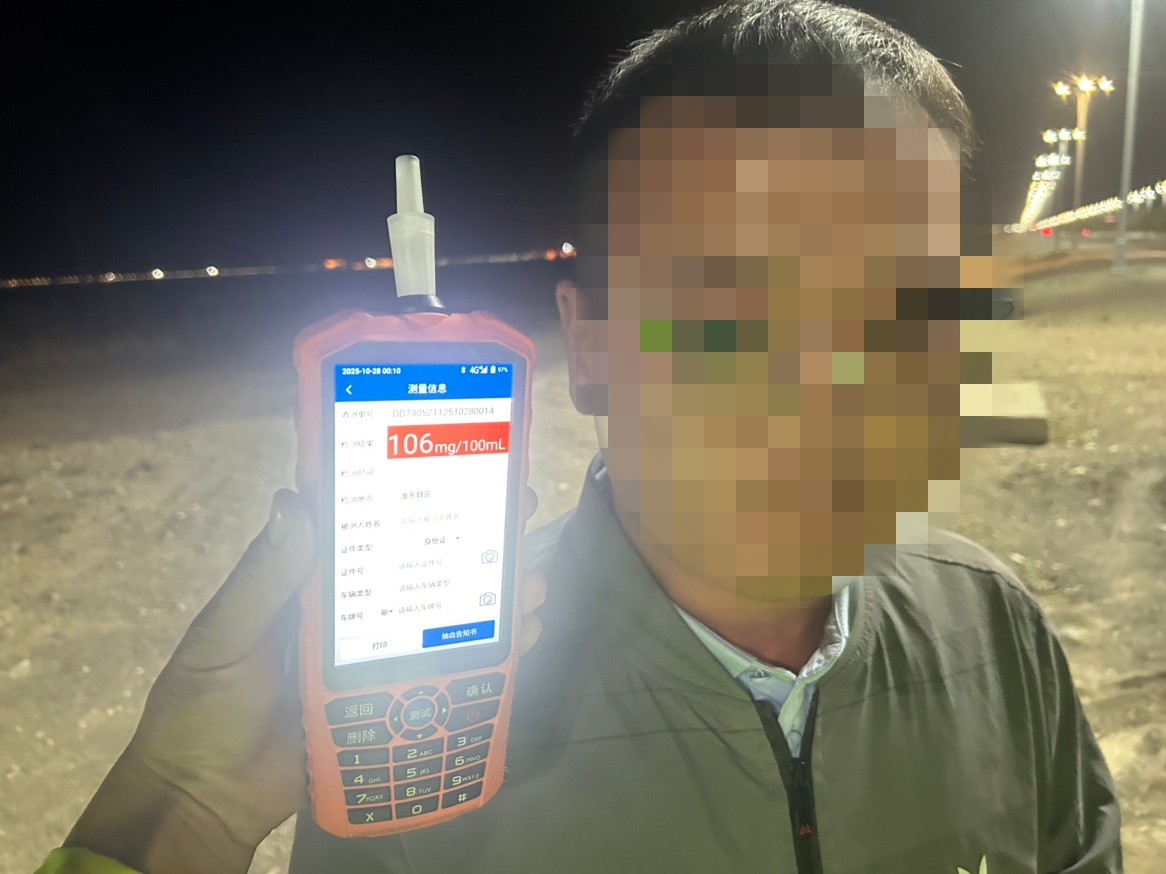 案例一、2025年10月28日00时10分,准东交通管理大队在Z917线5公里处夜检夜查时,发现一辆号牌为新AB***9的小型普通客车涉嫌酒后驾驶。执勤民警立即对驾驶员进行呼气式酒精检测仪检测,检测结果为106mg/100mL,属于醉酒驾驶机动车。