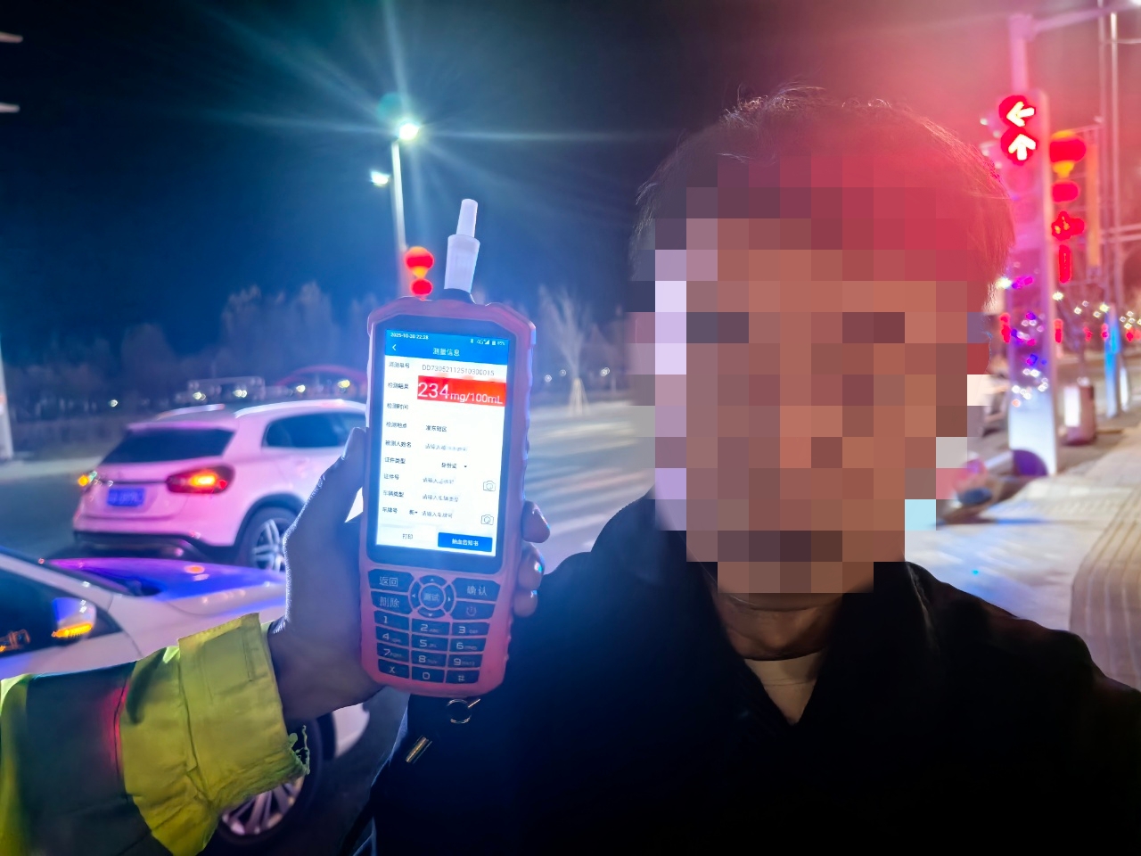 案例二、2025年10月30日22时28分,准东交通管理大队在准噶尔西路与黑石滩路十字路口处夜检夜查时,发现一辆号牌为新AU***2的小型普通客车涉嫌酒后驾驶。执勤民警立即对驾驶员进行呼气式酒精检测仪检测,检测结果为234mg/100mL,属于醉酒驾驶机动车。