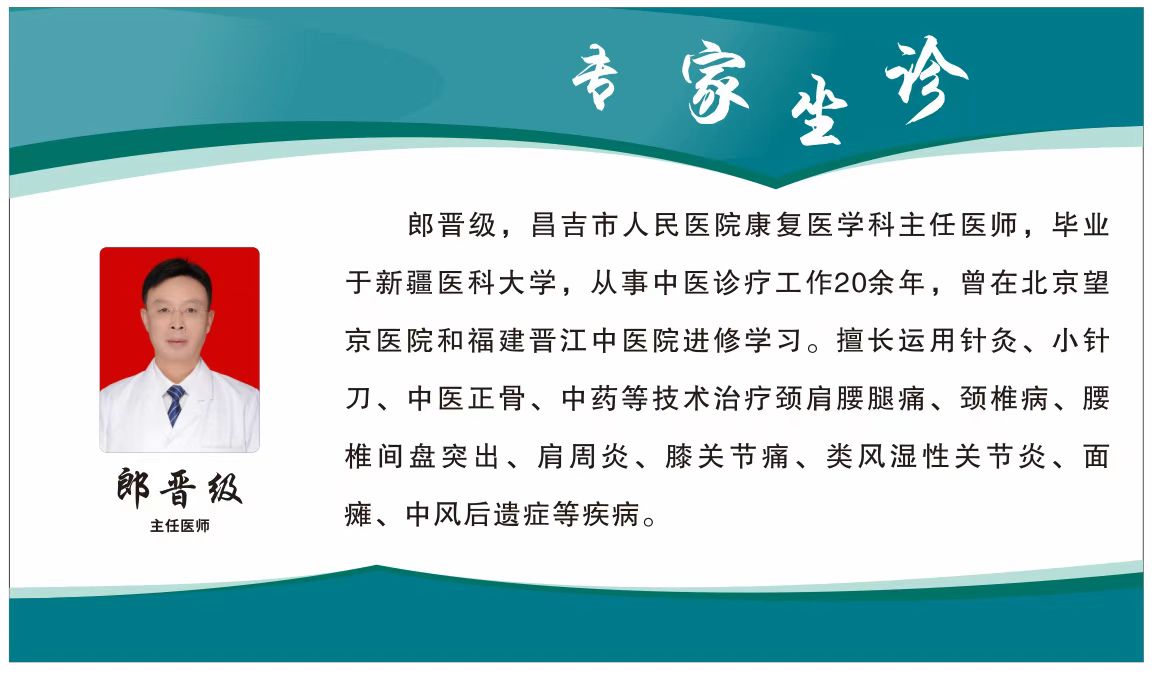 本周来准坐诊专家为新疆昌吉市人民医院康复医学科主任医师郎晋级,擅长运用针灸、小针刀、中医正骨、中药等技术治疗颈肩腰腿痛、颈椎病、腰椎间盘突出、肩周炎、膝关节痛、类风湿性关节炎、面瘫、中风后遗症等疾病;麻醉手术部主治医师金娇,擅长舒适化诊疗及小儿麻醉、头痛、神经痛、骨关节痛、组织疼痛及非疼痛性能疾病的诊治。