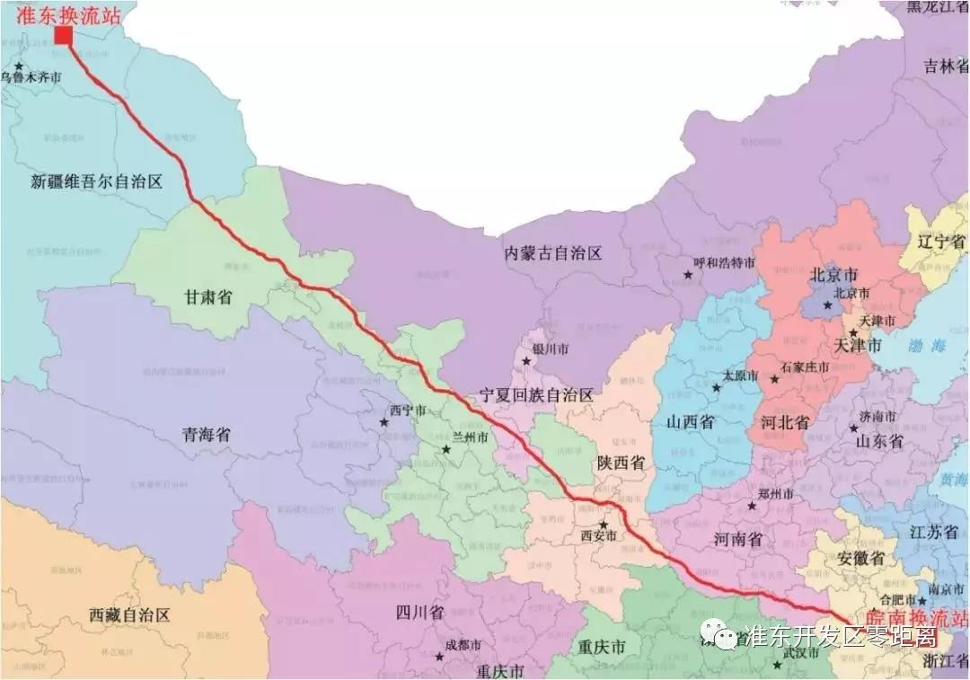 准东—皖南±1100千伏特高压直流输电工程起于新疆昌吉州昌吉换流站,止于安徽宣城市古泉换流站,途经新疆、甘肃、宁夏、陕西、河南、安徽六个省区,线路全长3324公里,是目前世界上电压等级最高、输送容量最大、输电距离最远、技术水平最先进的直流输电工程。