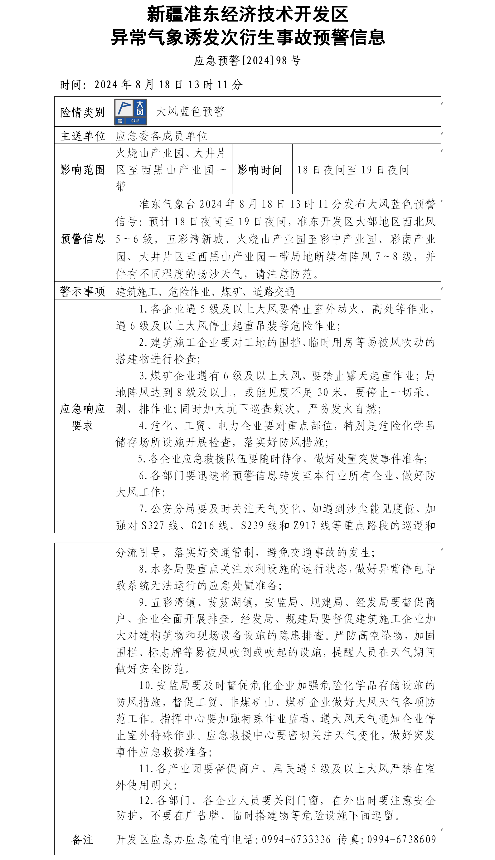新疆准东经济技术开发区异常气象诱发次衍生事故预警信息 应急预警[2024]98号