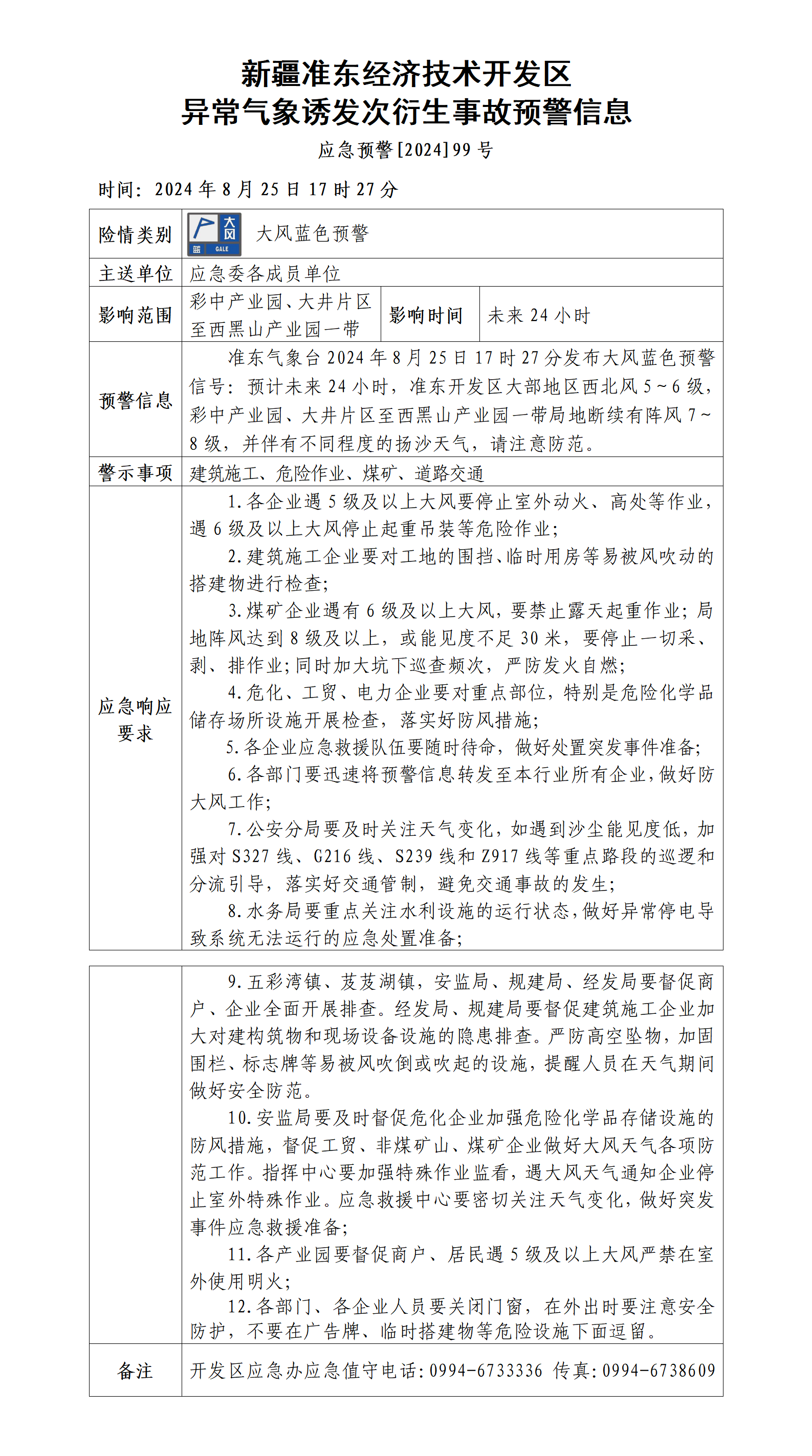 新疆准东经济技术开发区异常气象诱发次衍生事故预警信息 应急预警[2024]99号