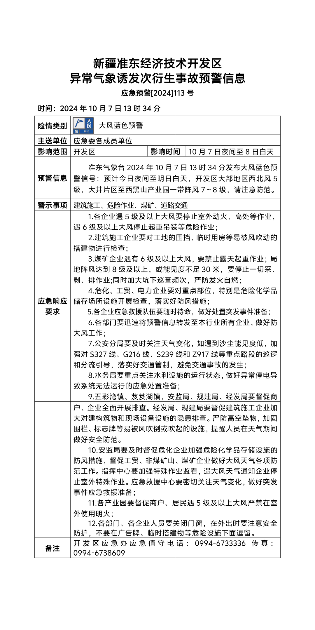 新疆准东经济技术开发区异常气象诱发次衍生事故预警信息 应急预警[2024]113号