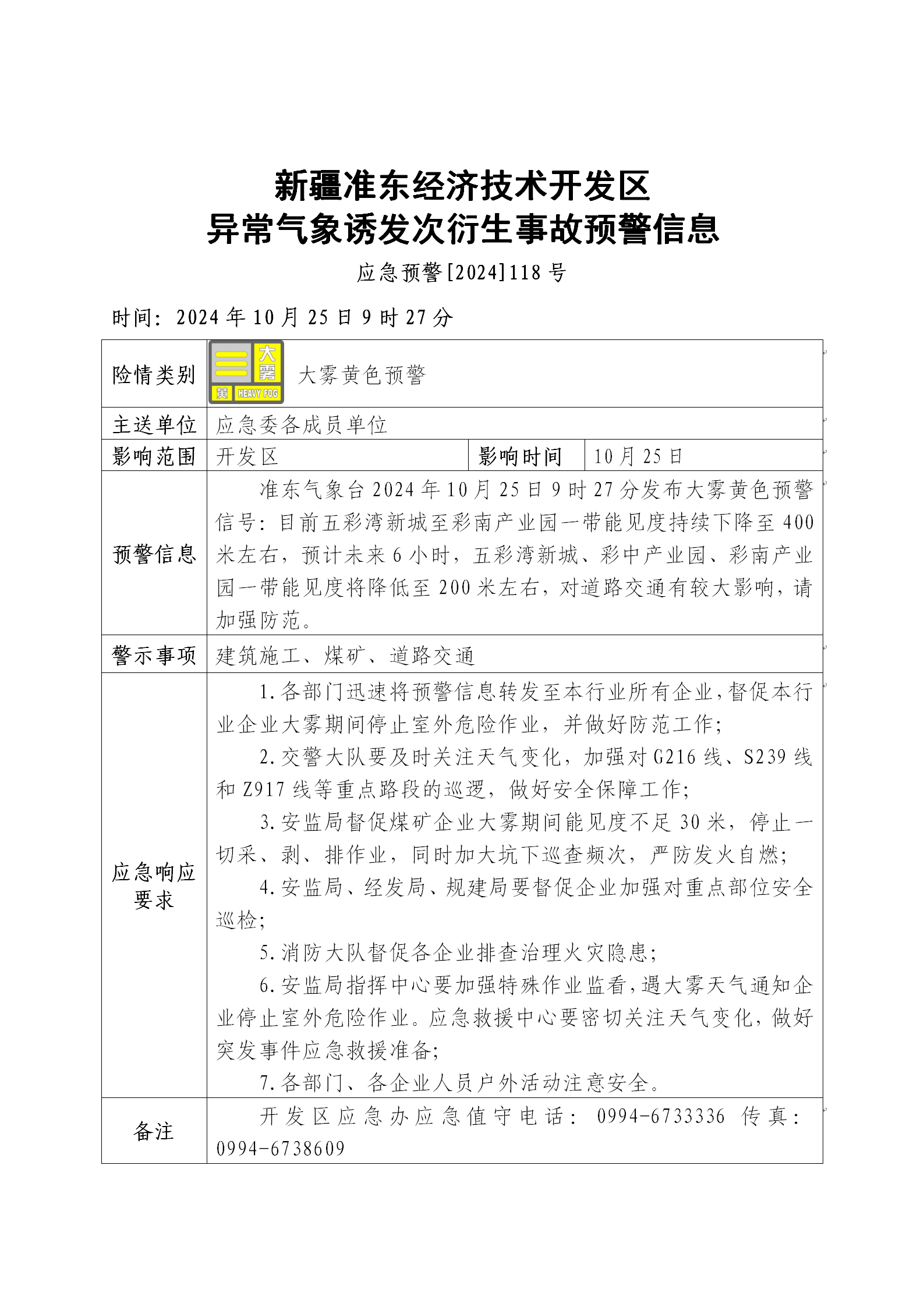 新疆准东经济技术开发区异常气象诱发次衍生事故预警信息 应急预警【2024】118号