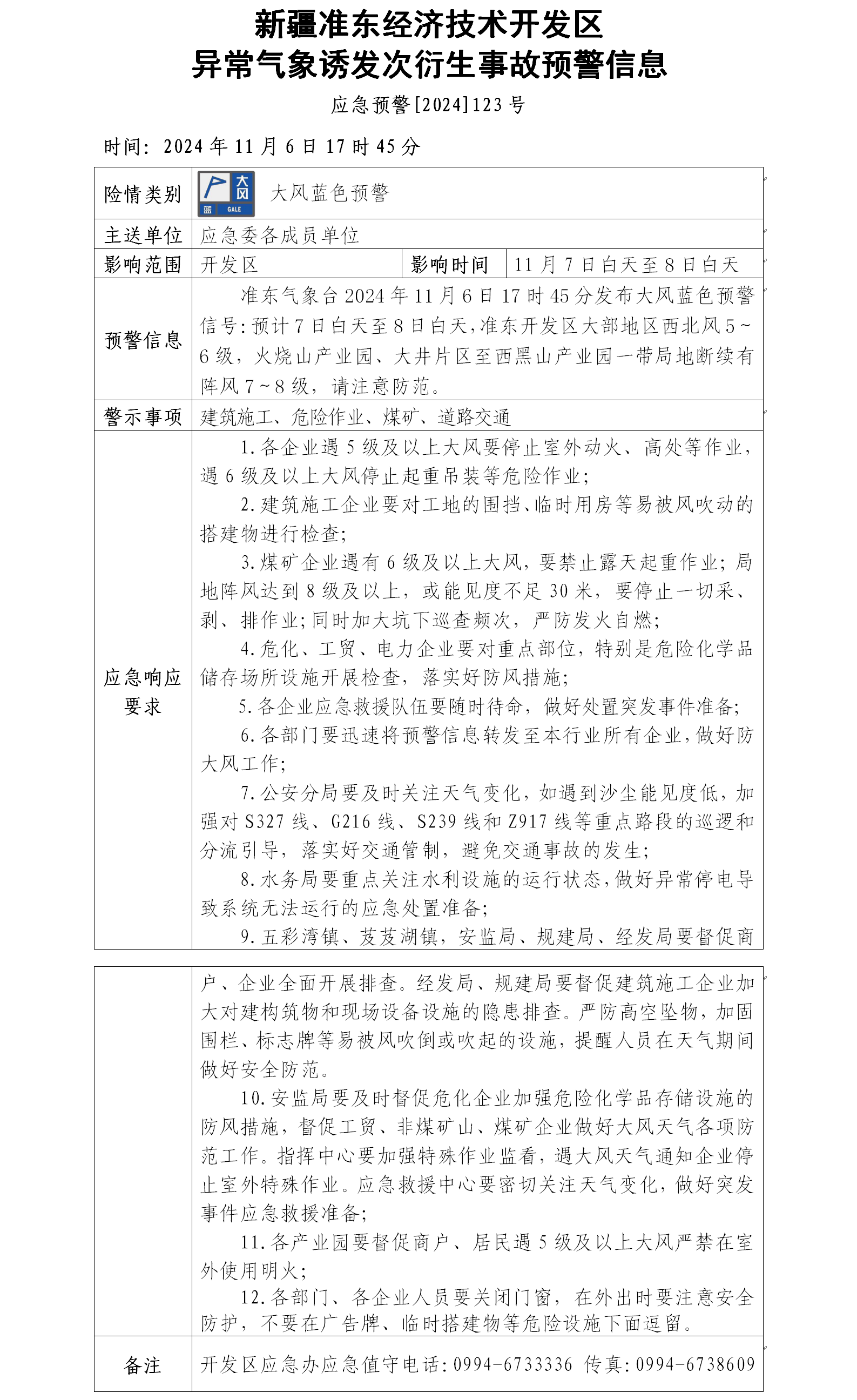 新疆准东经济技术开发区异常气象诱发次衍生事故预警信息