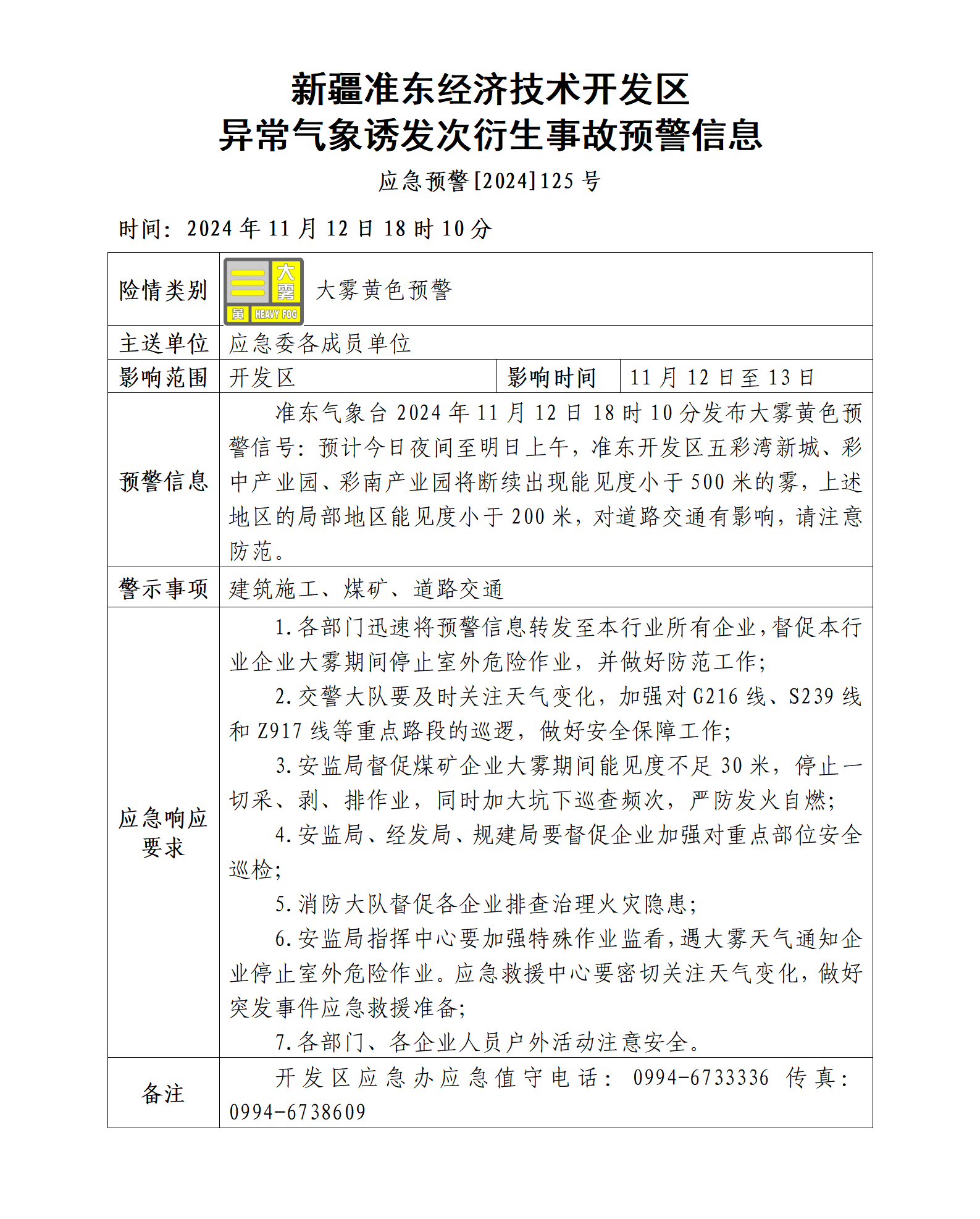 新疆准东经济技术开发区异常气象诱发次衍生事故预警信息