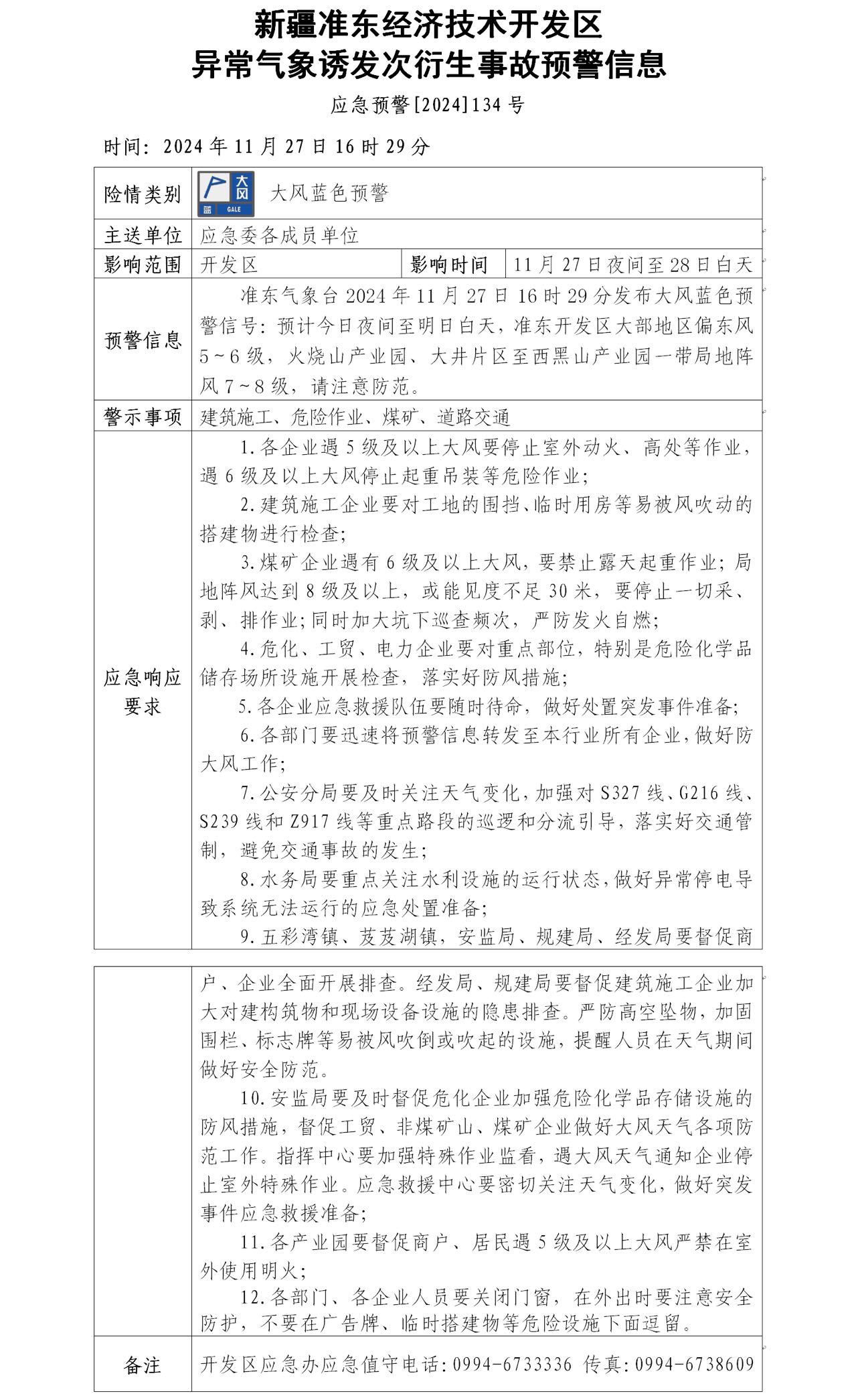 新疆准东经济技术开发区异常气象诱发次衍生事故预警信息