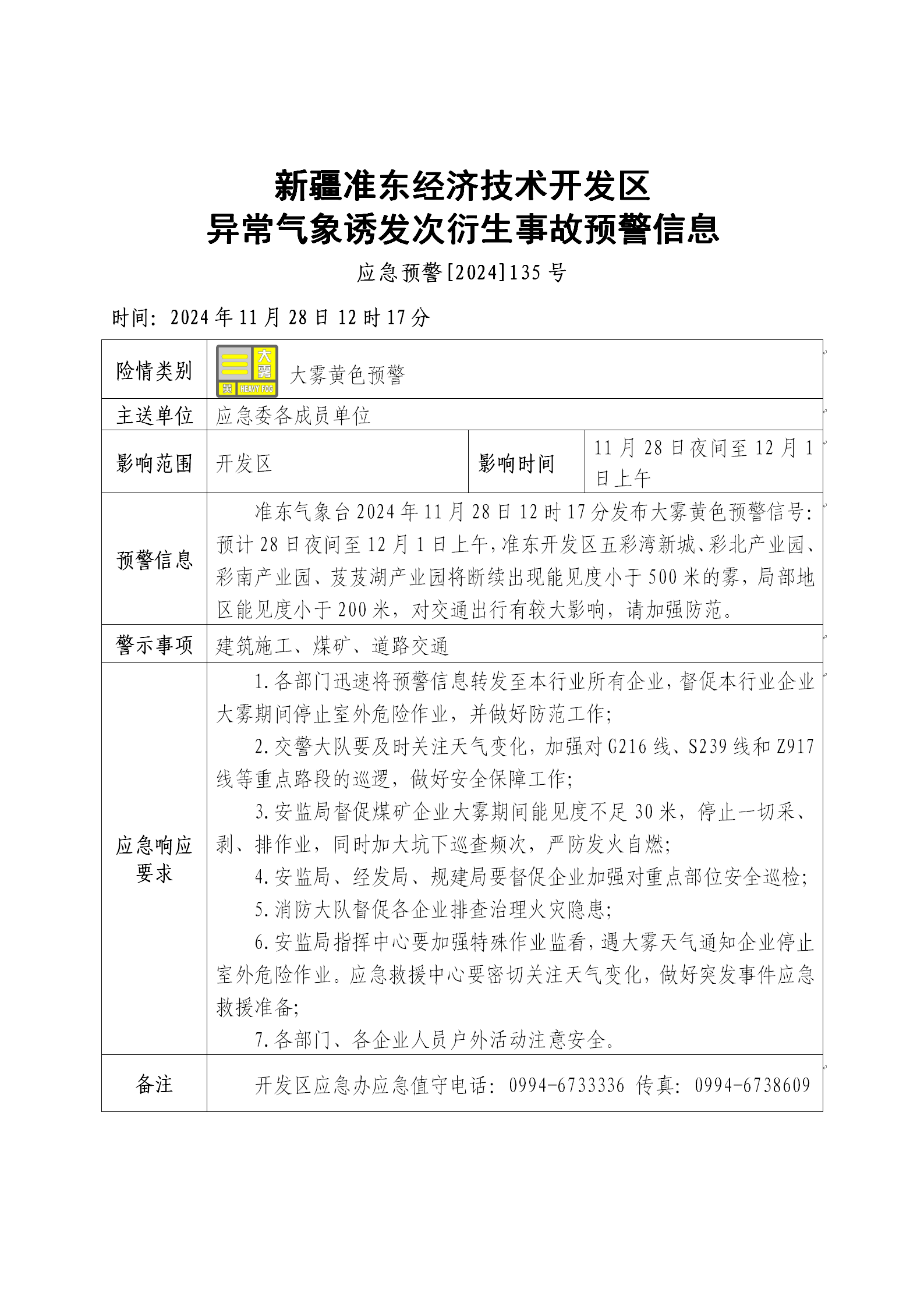新疆准东经济技术开发区异常气象诱发次衍生事故预警信息