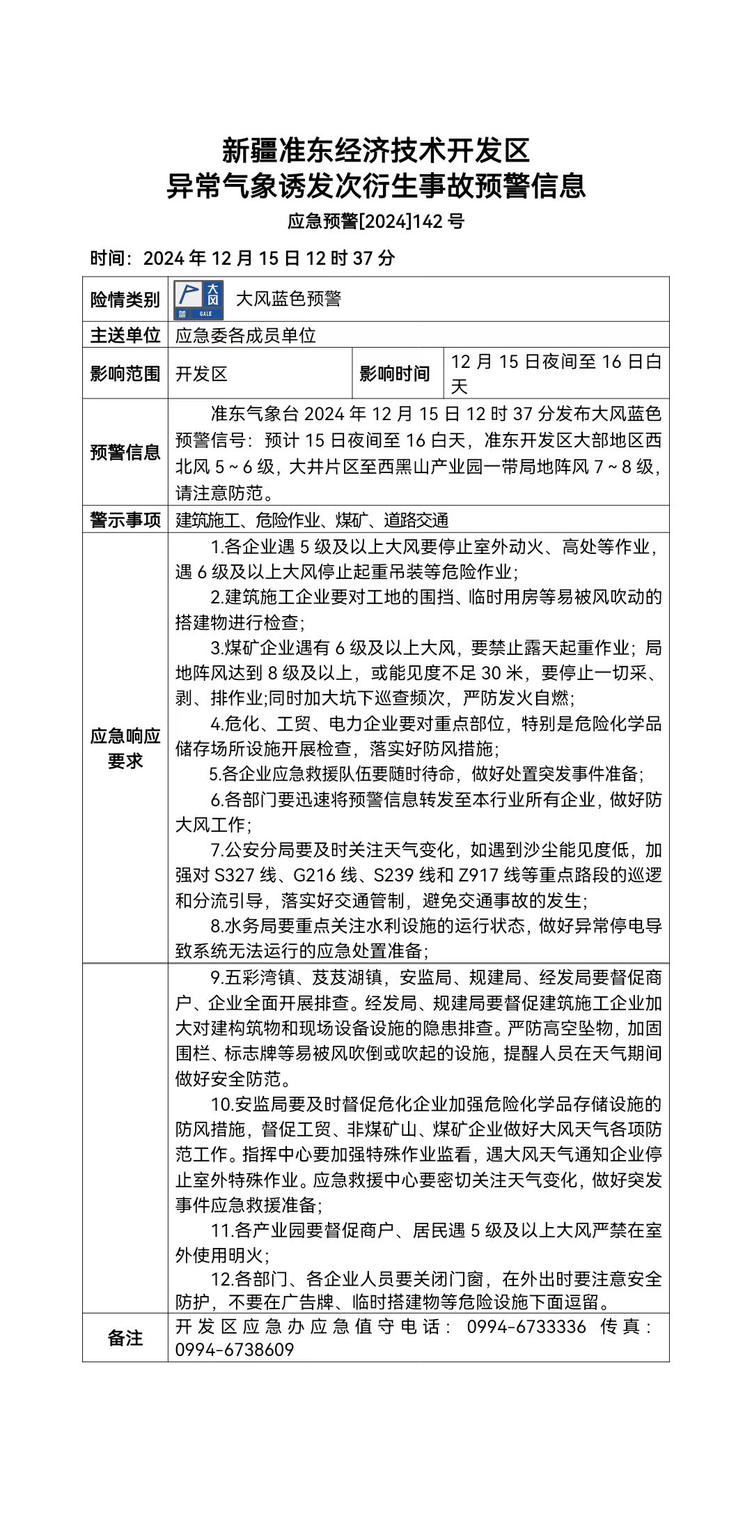 新疆准东经济技术开发区异常气象诱发次衍生事故预警信息