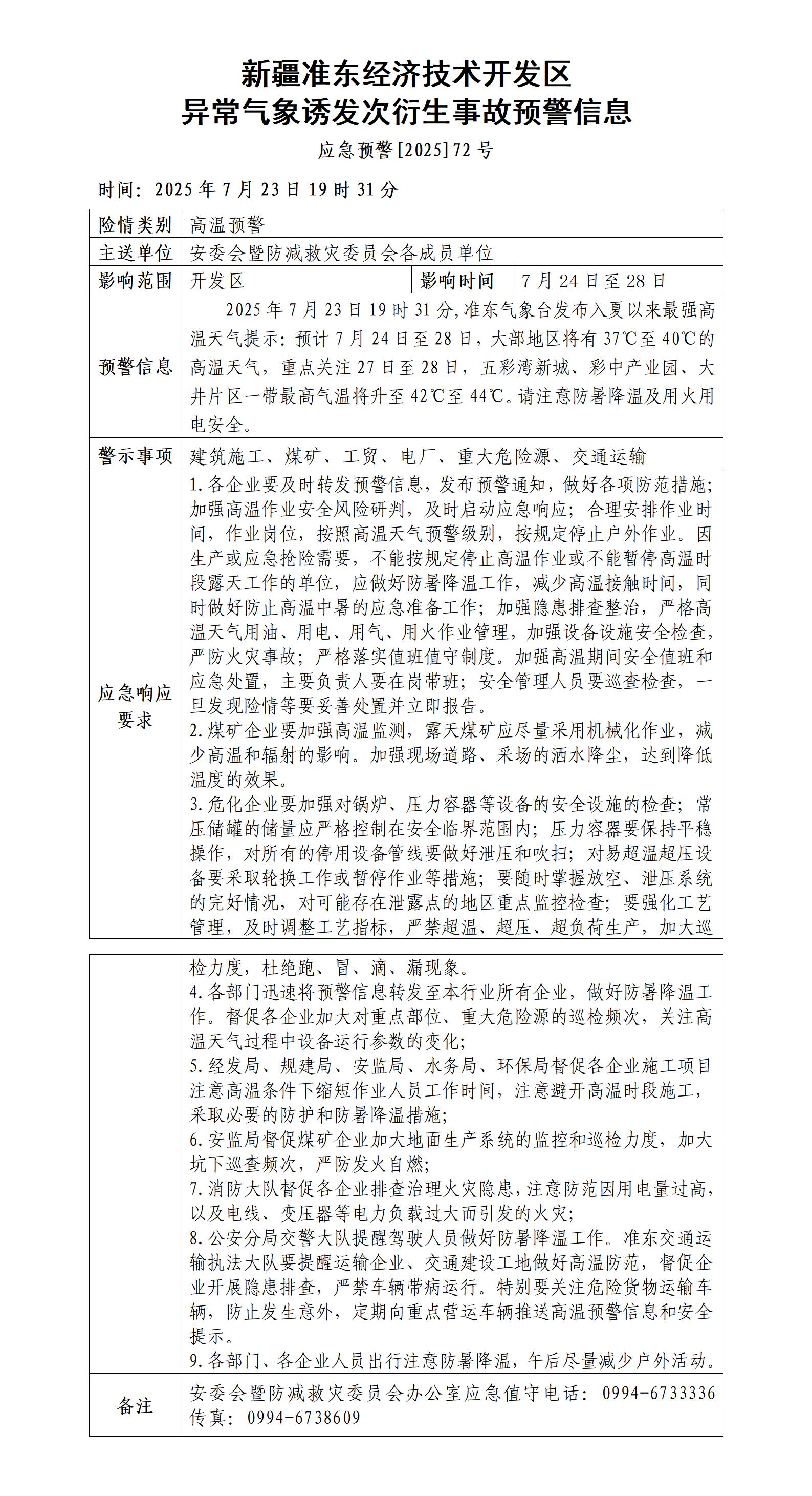 新疆准东经济技术开发区异常气象诱发次衍生事故预警信息