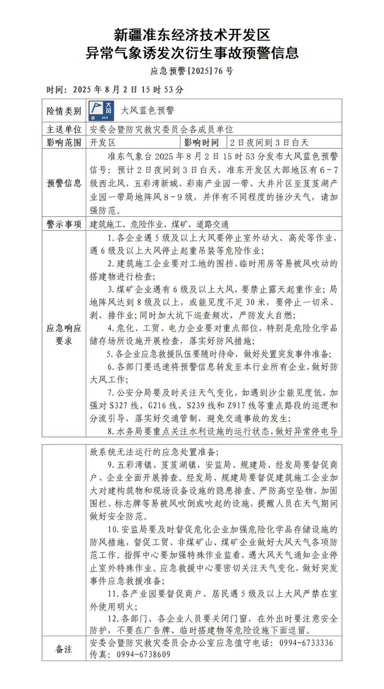 新疆准东经济技术开发区异常气象诱发次衍生事故预警信息
