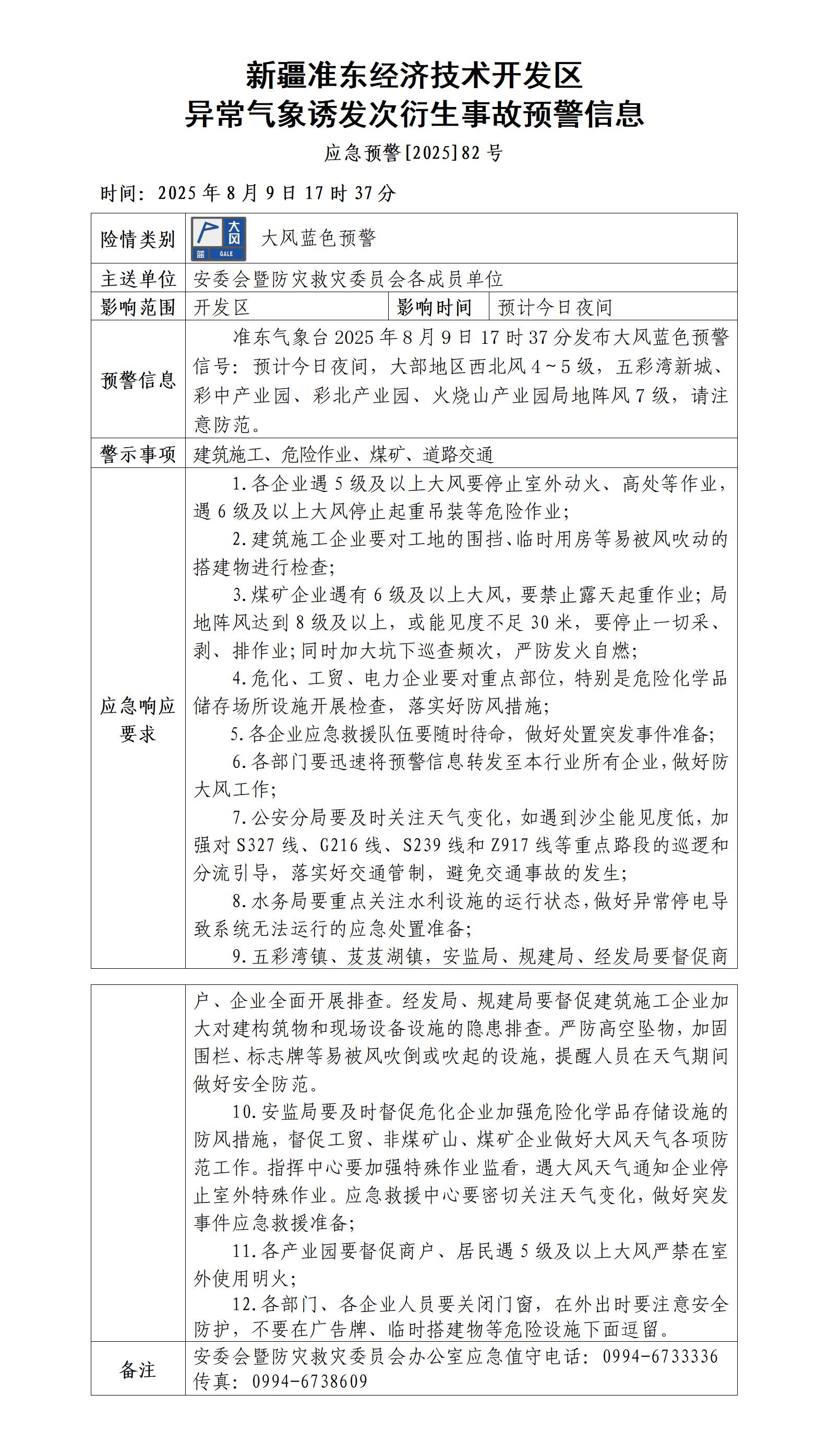 新疆准东经济技术开发区异常气象诱发次衍生事故预警信息