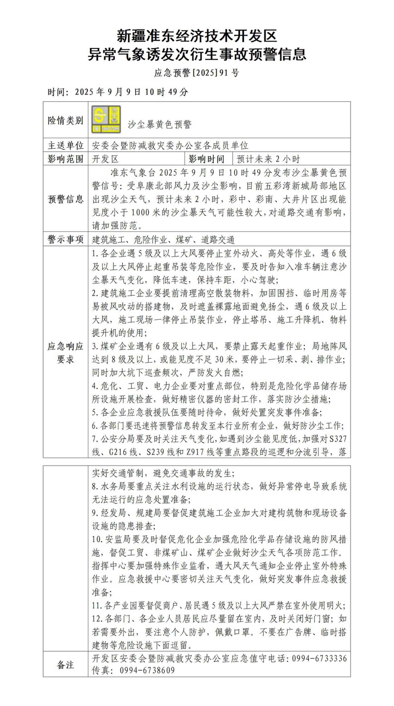 新疆准东经济技术开发区异常气象诱发次衍生事故预警信息