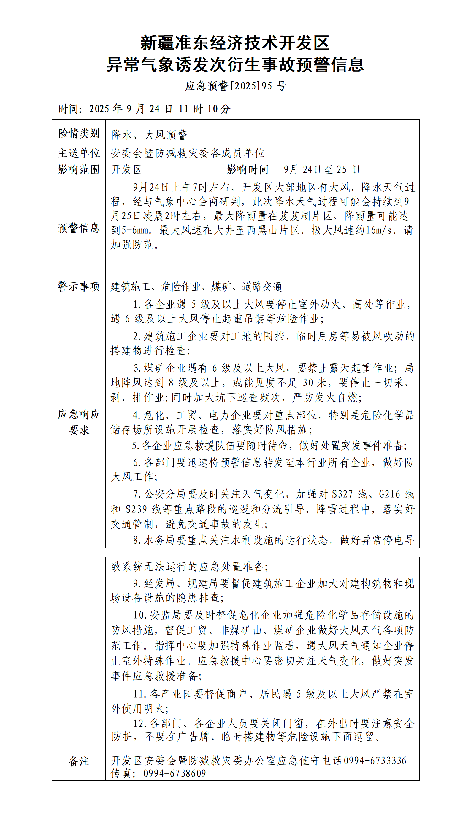 新疆准东经济技术开发区异常气象诱发次衍生事故预警信息