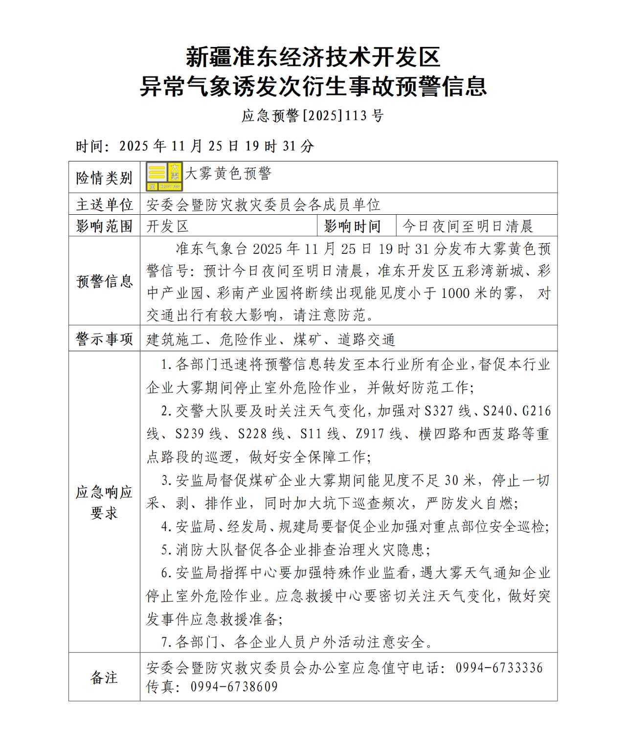 新疆准东经济技术开发区异常气象诱发次衍生事故预警信息