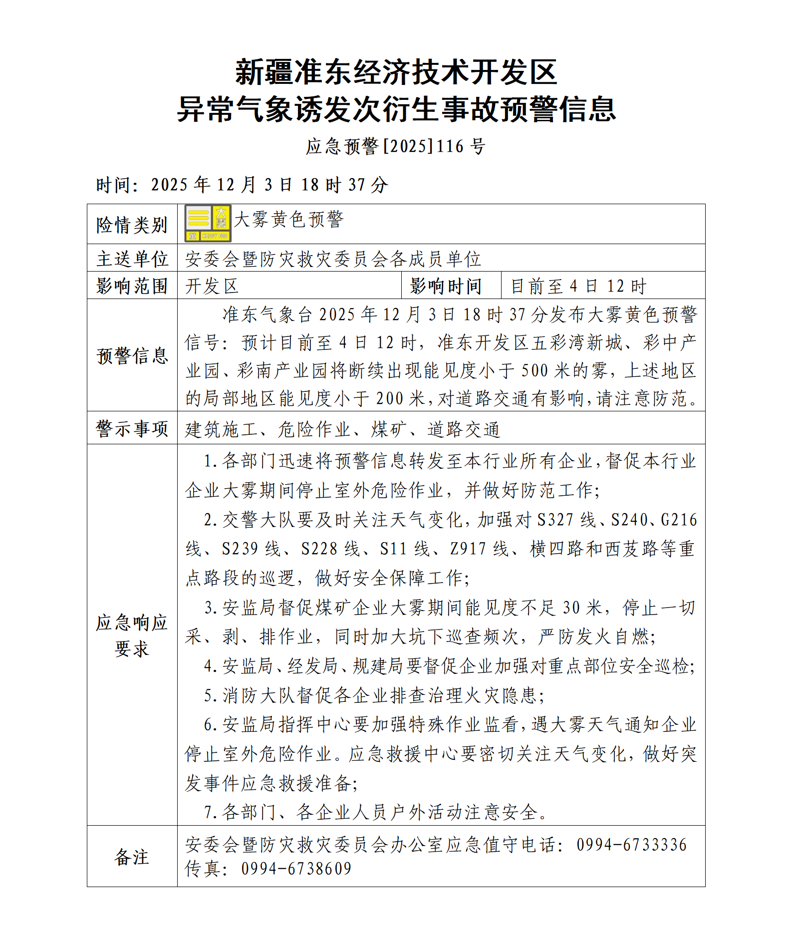 新疆准东经济技术开发区异常气象诱发次衍生事故预警信息