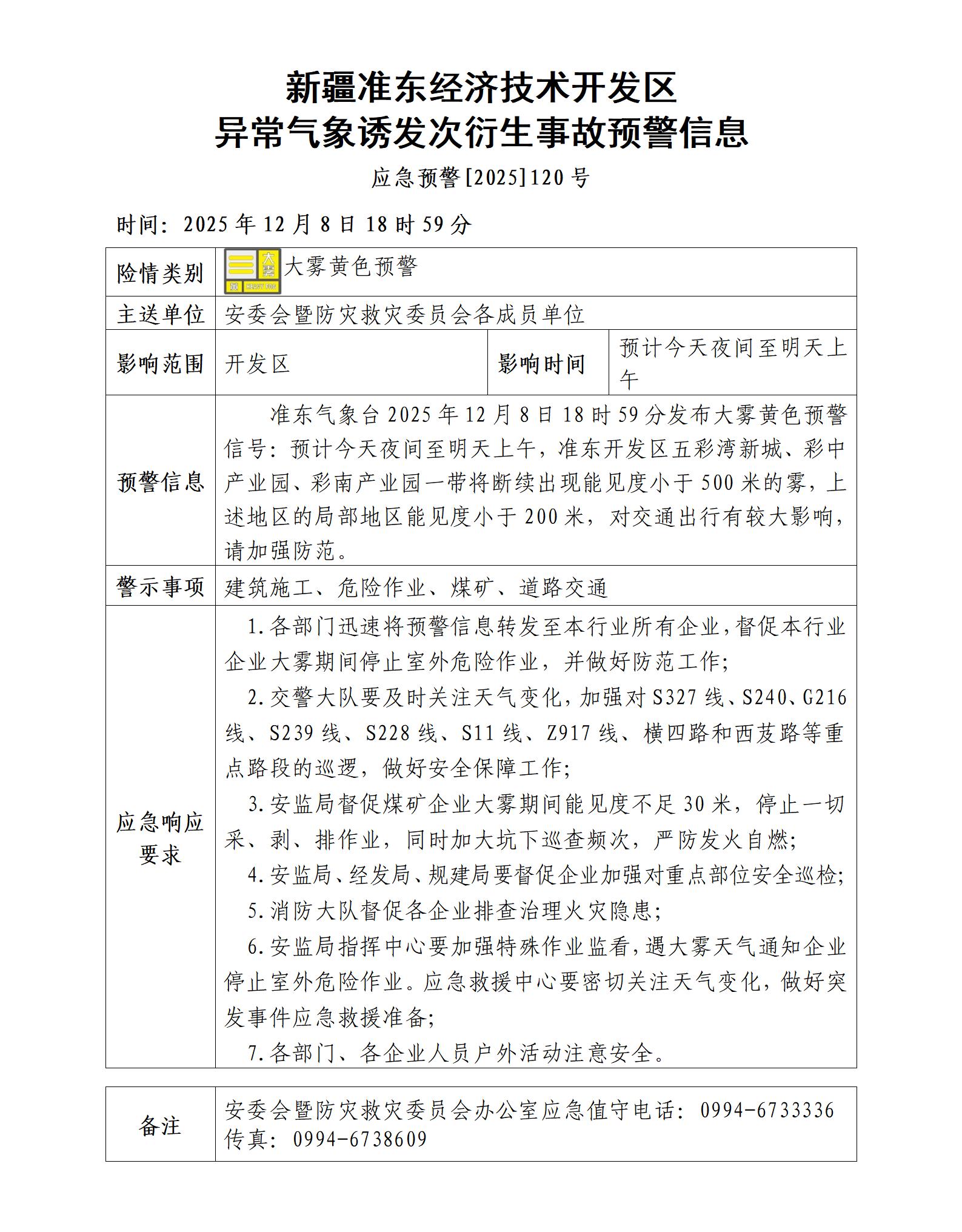 新疆准东经济技术开发区异常气象诱发次衍生事故预警信息