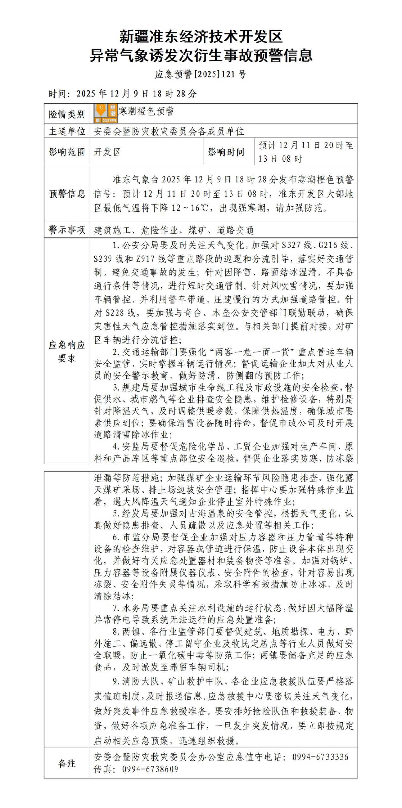 新疆准东经济技术开发区异常气象诱发次衍生事故预警信息
