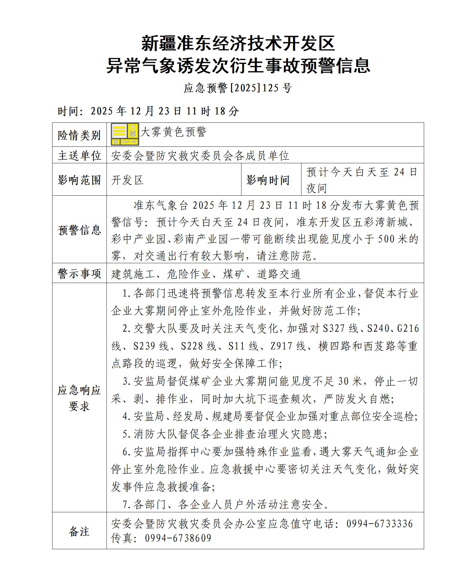 新疆准东经济技术开发区异常气象诱发次衍生事故预警信息