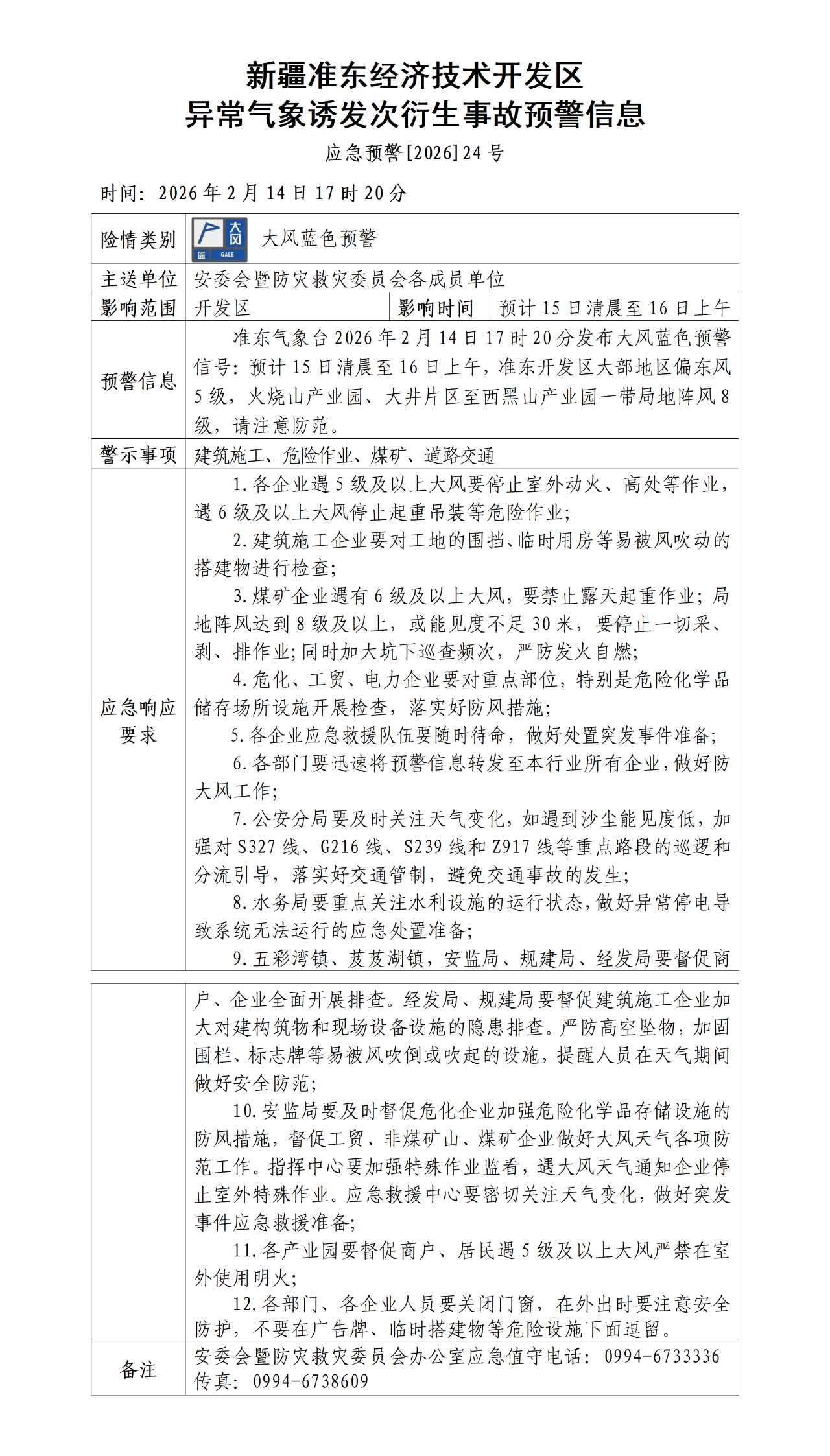 新疆准东经济技术开发区异常气象诱发次衍生事故预警信息