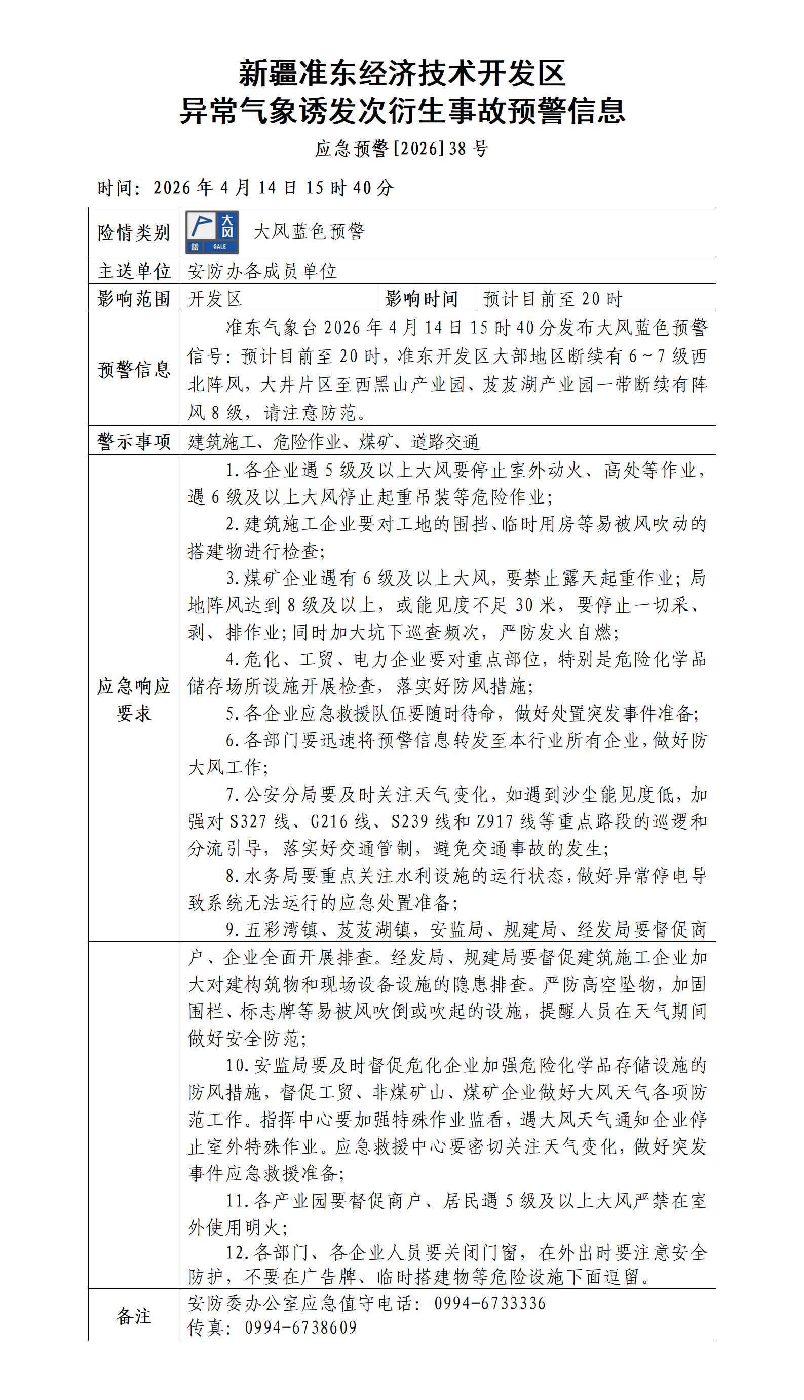 新疆准东经济技术开发区异常气象诱发次衍生事故预警信息