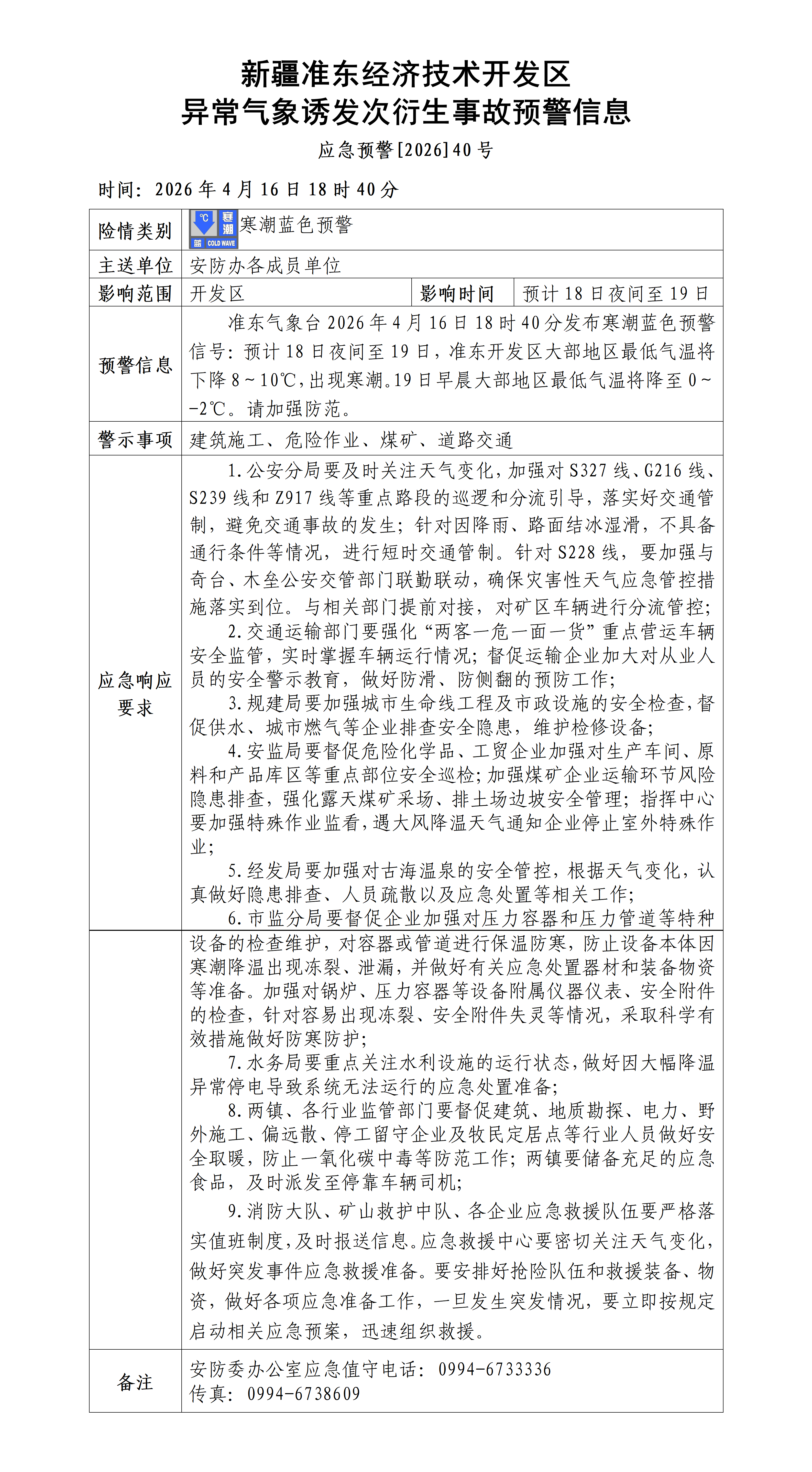 新疆准东经济技术开发区异常气象诱发次衍生事故预警信息