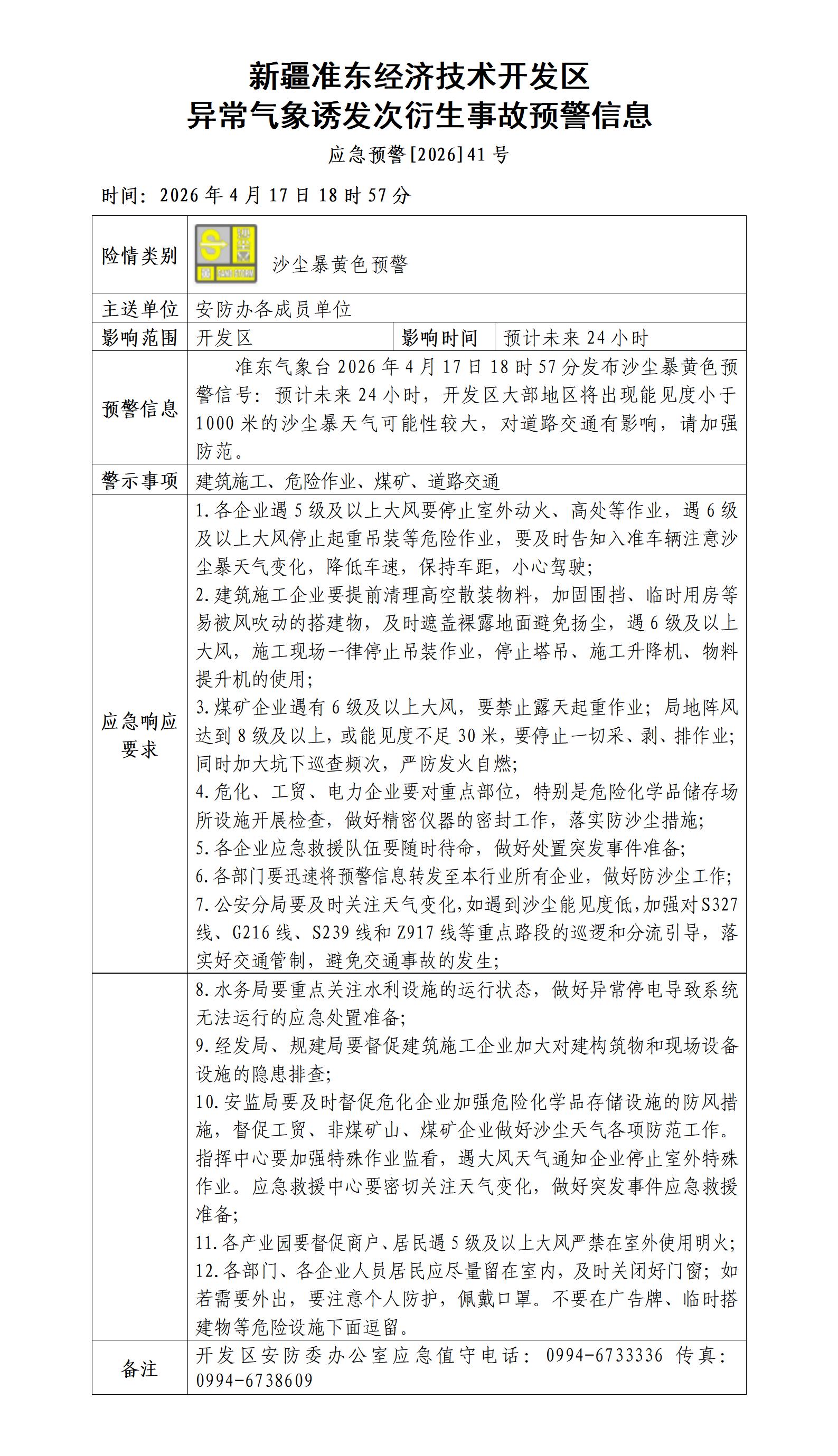 新疆准东经济技术开发区异常气象诱发次衍生事故预警信息
