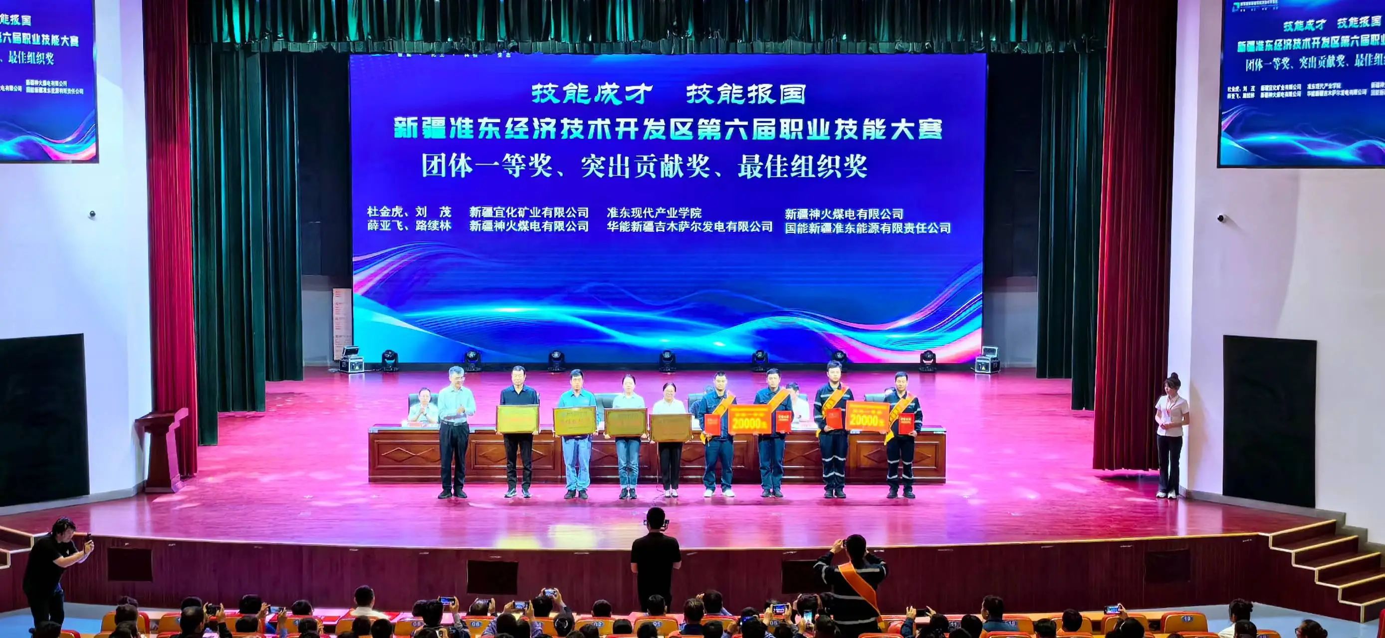 随着现场裁判员一声令下,各赛场选手们快速投入比赛,比赛现场气氛热烈,紧张有序,参赛选手们纷纷拿出看家本领,亮出绝活绝技。在国能新疆准东能源有限责任公司分赛场,挖掘机操作工比赛正紧张进行,选手们屏住呼吸,聚焦于眼前的挖掘机,借助铲斗支撑起重达20多吨的机身,灵活旋转后丝滑平稳跨越障碍物平稳落地,赢的在场观众阵阵掌声;铲斗轻轻铲起篮球,旋转机身180度,巧妙地将篮球投入篮筐;耙砖块时,铲斗“指尖”温柔细腻的将摞起来的砖从上至下逐层剥落;行车吊装水桶精准绕杆,电焊点对点无缝焊接,电路集成故障快速维修,烹饪花式造型色味俱佳,一项项比赛、一个个绝活精彩上演,娴熟高超的操作绝活令裁判员、现场工作人员和观摩人员声声喝彩,赞叹“大家伙”也能秀出“细花活”。通过两天激烈的比赛,共角逐出一等奖16名、二等奖32名、三等奖36名、绝技奖2名、突出贡献单位2个、最佳组织单位2个。