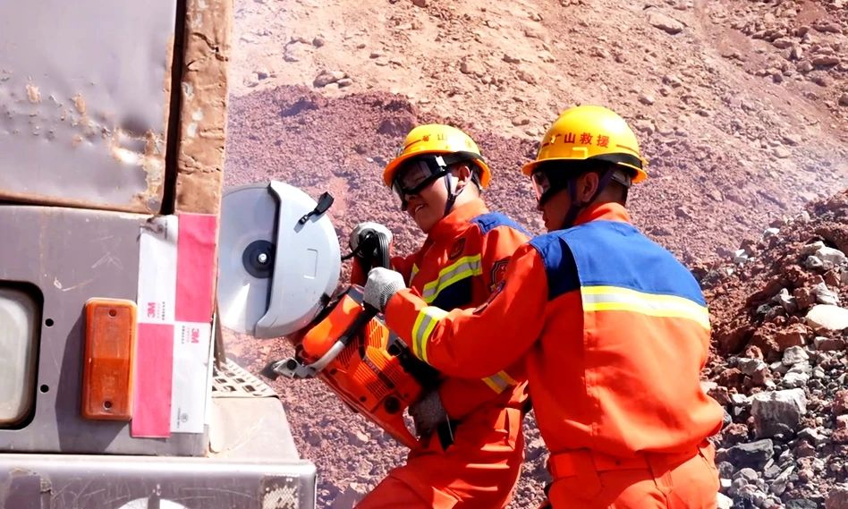 “事故”发生后,煤矿一边组织从踩坑下迅速撤人和运输车辆,一边组织施救。同时,向开发区管委会上报事故情况。开发区管委会接到报告后,立即组织公安分局、安监局、矿山救护中队、芨芨湖镇政府、芨芨湖镇卫生院等相关单位赶赴现场开展救援,布设边坡雷达监测设备对滑坡区域实时监测二次滑坡风险;征调挖掘机、铲车,在距离掩埋车辆、人员区域以外设置压坡角;使用热成像仪、生命探测仪对被掩埋车辆及人员进行搜寻;启动液压顶撑、破拆工具对被困车辆进行破拆。20分钟后,两名被困人员成功脱险,演练圆满结束。