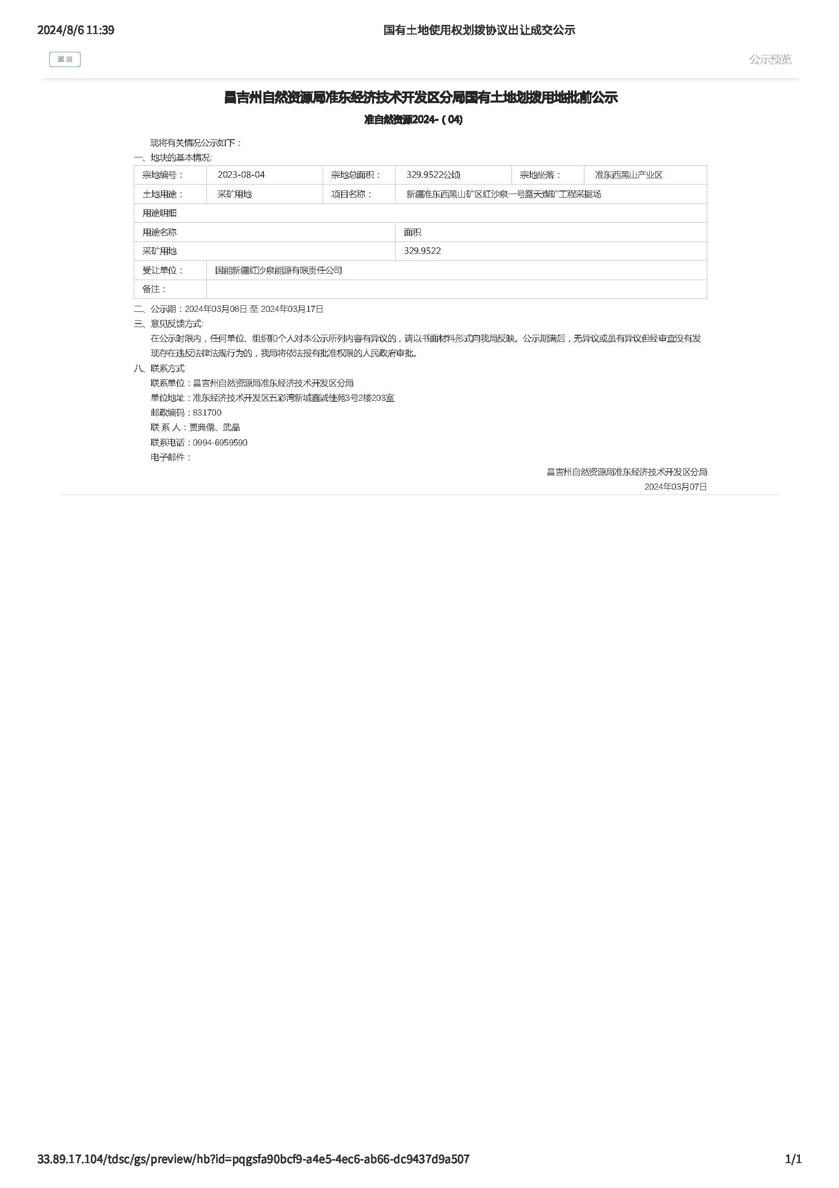 准自然资源2024-(04) 昌吉州自然资源局准东经济技术开发区分局国有土地划拨用地批前公示