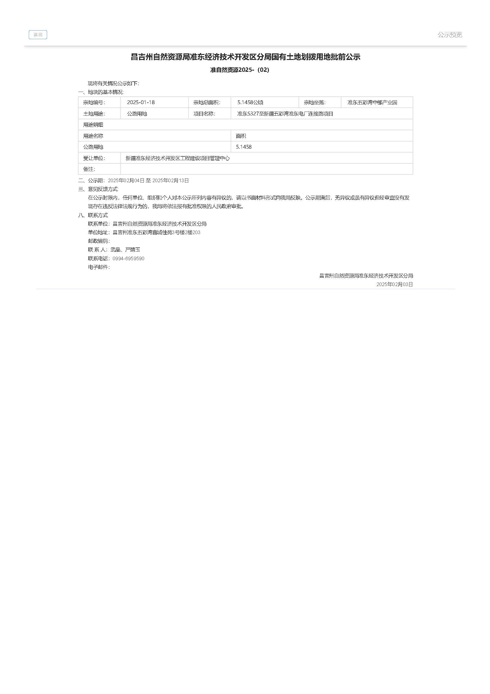 昌吉州自然资源局准东经济技术开发区分局国有土地划拨用地批前公示准自然资源2025-(0 2)