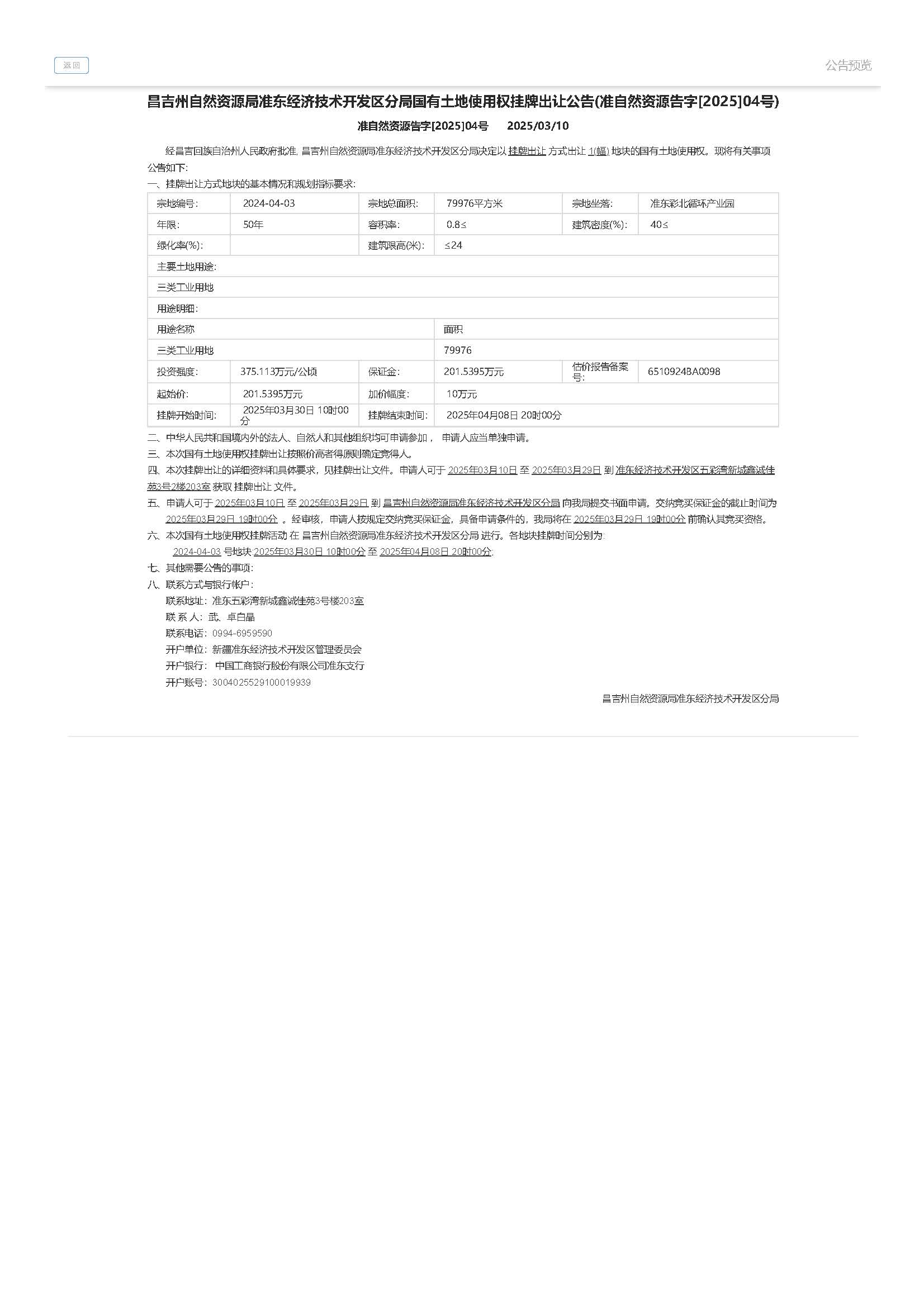 昌吉州自然资源局准东经济技术开发区分局国有土地使用权挂牌出让公告(准自然资源告字[20 25]04号)